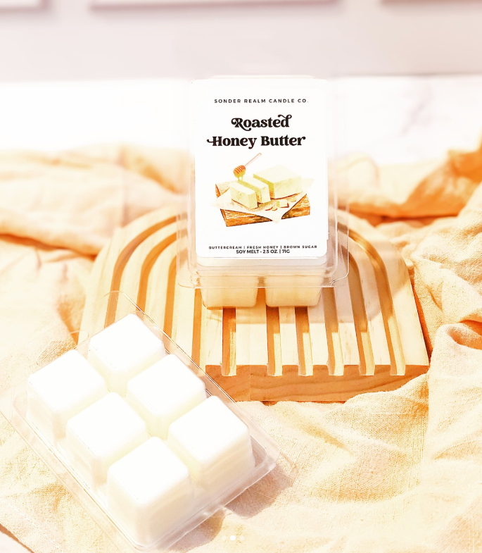 Melt away your stress with our Roasted Honey Butter wax melt. Made with fresh honey, buttercream, and whipped cream. This candle will fill your room with a sweet and cozy aroma. With hints of cinnamon and brown sugar, it's the perfect addition to any relaxing night in. Light it up and let the honey butter goodness calm your soul.